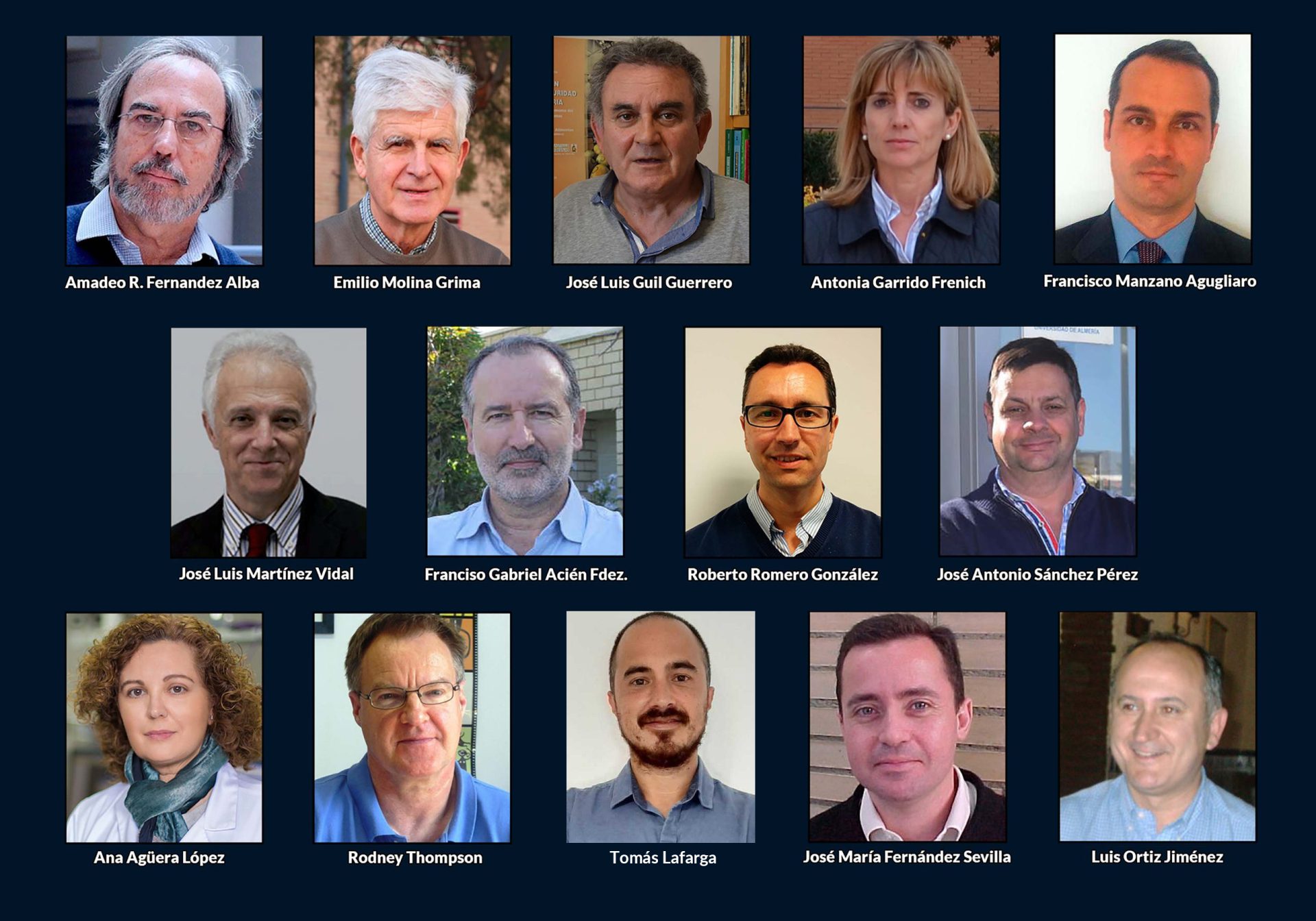 La lista continúa con Antonia Garrido Frenich (Química Analítica); Francisco Manzano Agugliaro (Área de Expresión Gráfica en la Ingeniería); José Luis Martínez Vidal (Química Analítica); Francisco Gabriel Acién Fernández (Ingeniería Química); Roberto Romero González (Química Analítica); José Antonio Sánchez Pérez (Ingeniería Química); Ana Agüera (Química Analítica); Rodney Thompson (Producción vegetal); Tomás Lafarga (Ingeniería Química); José María Fernández Sevilla (Ingeniería Química) y Luis Ortiz Jiménez (Departamento de Educación).