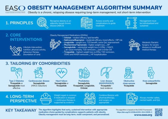 Dado que cada medicamento difiere en su eficacia para la pérdida de peso y en sus efectos sobre las complicaciones asociadas, la terapia personalizada se ha convertido en una necesidad. El nuevo algoritmo desarrollado por la EASO toma como criterio central la presencia o ausencia de complicaciones relacionadas con la obesidad, evaluando cada fármaco en función de su eficacia en la pérdida de peso, su impacto sobre dichas complicaciones y su perfil de seguridad. McGowan ha subrayado que “es el primer marco guiado por la presencia o ausencia de complicaciones, ya que la pérdida de peso no es el único objetivo del tratamiento cuando existen comorbilidades”.