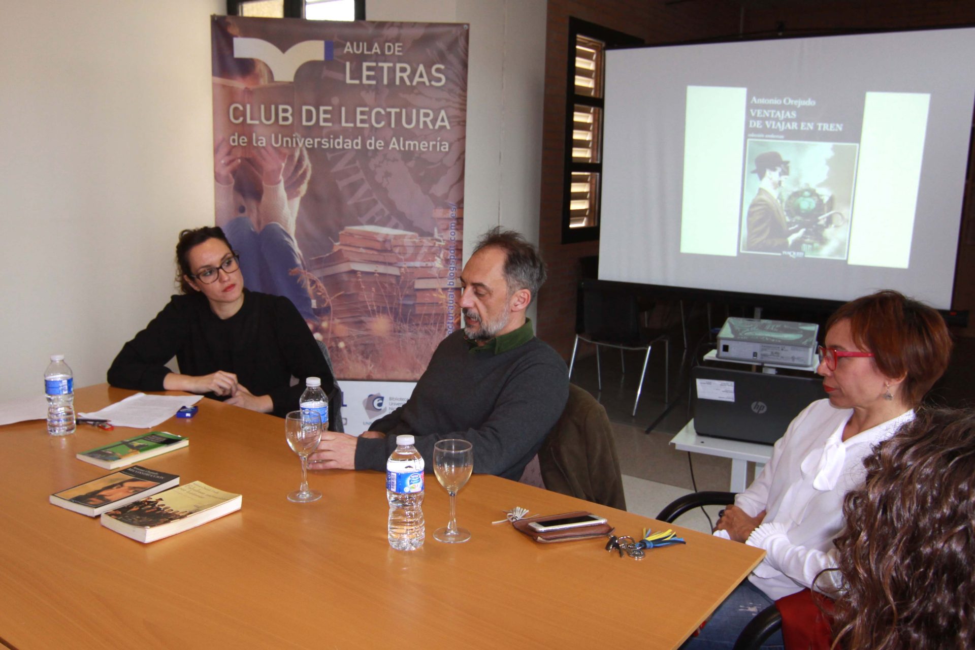 El Club de Lectura de la Universidad de Almería está abierto a todos los almerienses que deseen disfrutar del placer de la lectura y el debate, ya que surge con el fin de construir nuevos espacios de reflexión en la comunidad universitaria y la sociedad en general. Las ‘Ventajas de viajar en tren’ de Antonio Orejudo, ha protagonizado este encuentro con las letras de un club que está dirigido por Raquel Fernández Cobo, licenciada en Filología Hispánica. El escritor, y profesor de Literatura, de la Universidad de Almería, ha asistido como invitado de honor a esta primera reunión, acompañado por la vicerrectora de Extensión Universitaria y Deportes, María del Mar Ruiz. Tras la historia narrada por Orejudo, los lectores han realizado otras lecturas como la de ‘El gran Gatsby’ de Scott Fitzgerald; ‘Sin destino’, de Imre Kertész; o ‘El beso de la mujer araña’ de Manuel Puig.