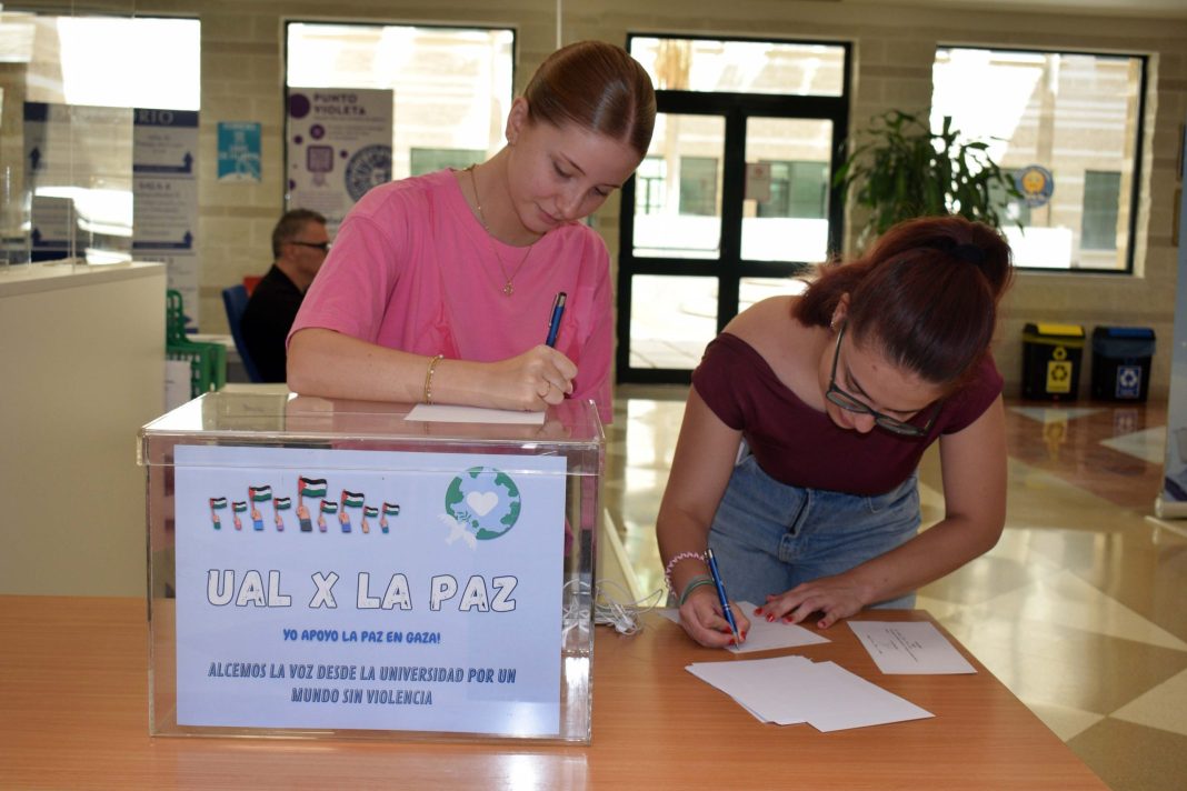 Desde este viernes el campus de la Universidad de Almería cuenta con unas urnas en las que los estudiantes y resto de comunidad universitaria podrán expresar sus deseos de paz y fin de los conflictos bélicos, especialmente vinculados al conflicto en Palestina. Bajo el lema ‘UAL x la paz’ se han instalado seis urnas en puntos del campus, la primera en la Biblioteca Nicolás Salmerón.