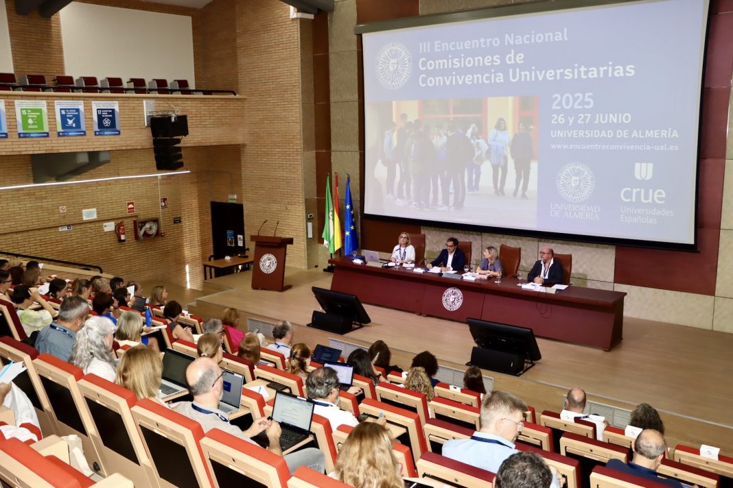 El Auditorio de la Universidad de Almería está acogiendo durante dos jornadas de trabajo, divididas en cinco sesiones temáticas, el III Encuentro Nacional de Comisiones de Convivencia Universitarias, un espacio plenamente consolidado y compartido por las universidades españolas para la reflexión y el intercambio de experiencias en esta materia. Se ha planteado bajo un enfoque participativo y colaborativo, haciendo valer su alta tasa de inscripción, con más de un centenar de participantes, para avanzar conjuntamente hacia una mejor gestión de la convivencia en el ámbito universitario. Así, especialistas y miembros de las comisiones de convivencia de un buen número de universidades están abordando estrategias de prevención y resolución de conflictos, la aplicación de procesos restaurativos y el papel de la mediación para construir entornos educativos más inclusivos y respetuosos.