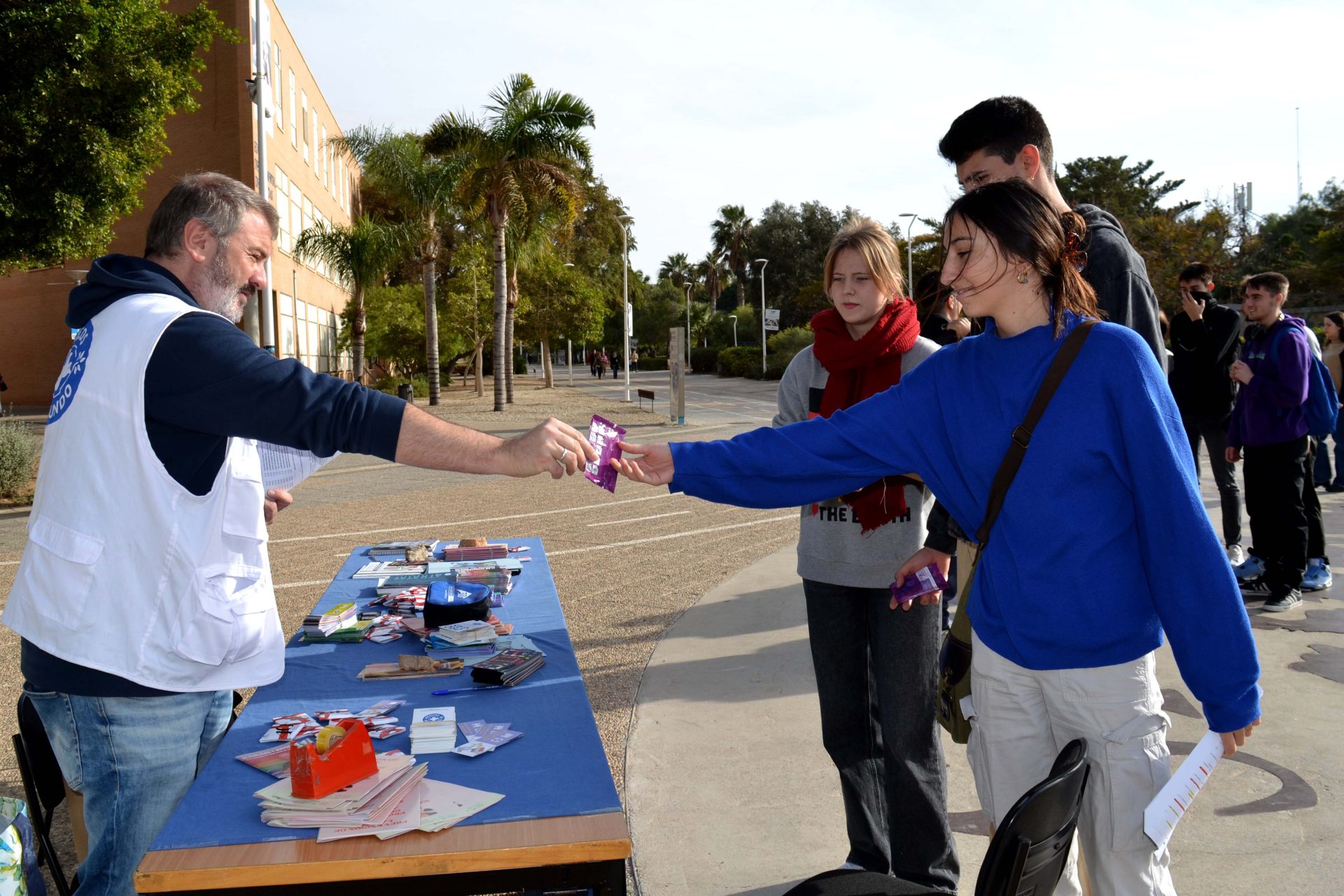 La asociación ha visitado el campus de La Cañada con una mesa informativa por la que han ido pasando decenas de estudiantes y resto de personal de la comunidad universitaria. En ella, han podido resolver dudas acerca de esta enfermedad, así como llevarse material preventivo compuesto por profilácticos para mujer y hombre y dental damm, que previene la transmisión de enfermedades a través del sexo oral.