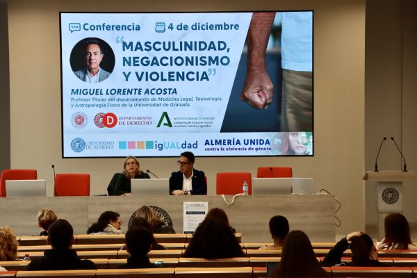Entre las voces acreditadas con las que cerrar el ciclo de actividades de ‘Almería Unida contra la Violencia de Género’, y más en concreto la Microcredencial de la Red Ciudadana contra la Violencia de Género organizada por la UAL, la elegida ha sido la del prestigioso Miguel Lorente, profesor titular de la Universidad de Granada, Doctor en Medicina y Cirugía con Premio Extraordinario, especialista en Medicina Legal y Máster en Bioética y Derecho por la Universidad de Barcelona. Habitual en el campus almeriense para compartir su vasta experiencia y su compromiso con la investigación sobre esta lacra social, en esta ocasión ha explicado desde el propio título de su charla ‘Masculinidad, Negacionismo y Violencia’, que la unión de esos conceptos conlleva un peligro mayúsculo para la sociedad.