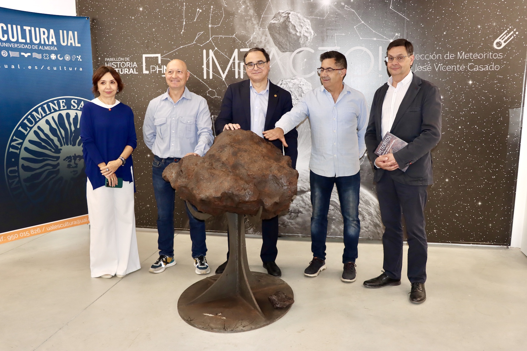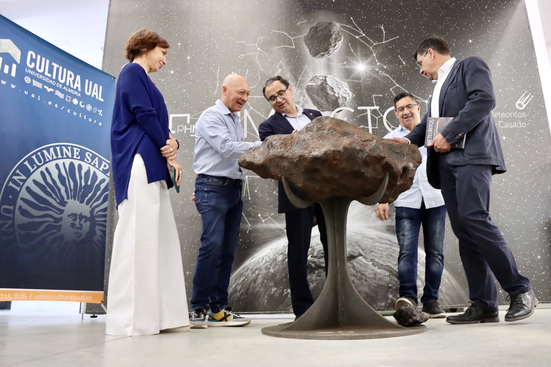 Seiscientos kilos de peso y 3.750 millones de años de antigüedad. Así se presenta la pieza central de las 50 que han llegado al Pabellón de Historia Natural de la Universidad de Almería desde el espacio exterior. De por medio es cierto que han intervenido las manos y el conocimiento de José Vicente Casado, el único ‘cazameteoritos’ profesional de nuestro país. Su trayectoria es extraordinaria, a la altura de la pasión con la que explica lo que comparte en esta exposición, habiendo hallado a lo largo de su vida hasta 600 meteoritos. Esa cifra supone el 1% del total mundial. ‘Impacto!!’ es parte de su legado, una muestra que ya está a disposición de la sociedad y que permanecerá abierta hasta el próximo 31 de julio. En la presentación ha quedado muy claro que es una gran oportunidad que tanto especialistas como familias no deben dejar pasar.
