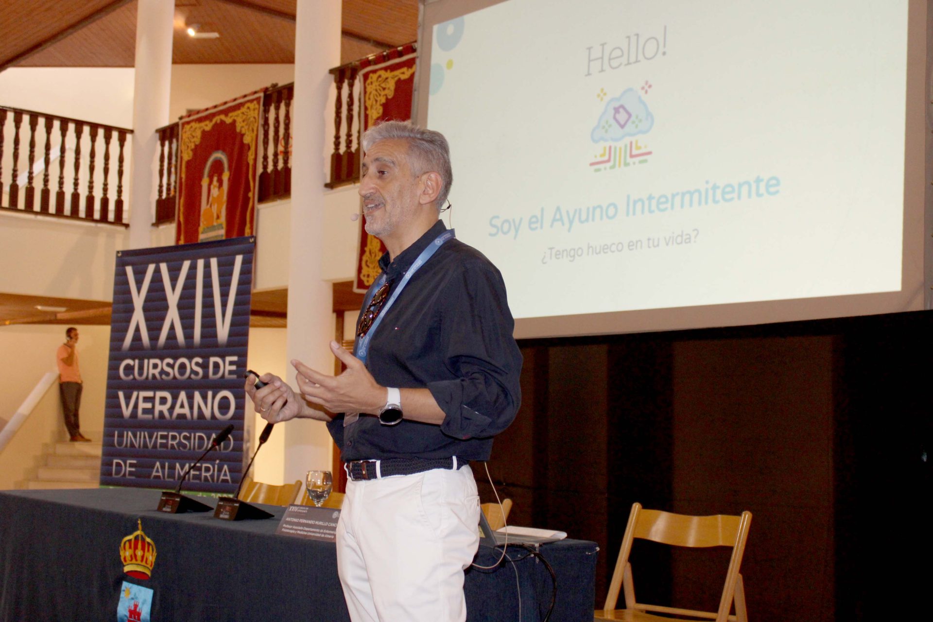 El primero de estos especialistas, y por lo tanto también primer ponente de los Cursos de Verano 2023 en general, ha sido Antonio Fernando Murillo, profesor del Departamento de Enfermería, Fisioterapia y Medicina de la Universidad de Almería, cofundador y director científico de NutriSanum, una entidad dedicada al estudio de los patrones alimentarios y su relación con la salud humana. En concreto, sus clases en la UAL versan sobre Nutrición y Bromatología, siendo también profesor en el Grado de Nutrición Humana y Dietética de la Universidad de Alcalá de Henares, así como director del Curso Experto en Nutrición Deportiva de la Universidad Internacional de La Rioja. Su ponencia, la inaugural de esta edición vigésimo cuarta de los seminarios estivales, ha tenido por título ‘Ayuno intermitente: ¿Una moda esnobista o un hábito saludable en nutrición?’.