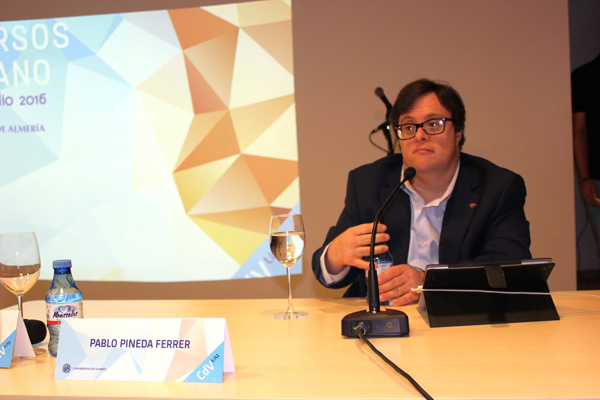 Es un ejemplo de superación y de que nunca se debe tirar la toalla. El malagueño, Pablo Pineda, único europeo con síndrome de Down con carrera universitaria, ha clausurado en Purchena, este viernes, 15 de julio, el Curso de Verano ‘Menores: educación y valores’ y lo ha hecho hablando de inclusión social. “La única forma de romper los prejuicios sociales es a través de la inclusión, por tanto a los estudiantes les he dado el mensaje de que la mejor manera de hacerlo es ir conociendo de manera profunda a las personas con otras capacidades y que esto les va a enriquecer como personas”.