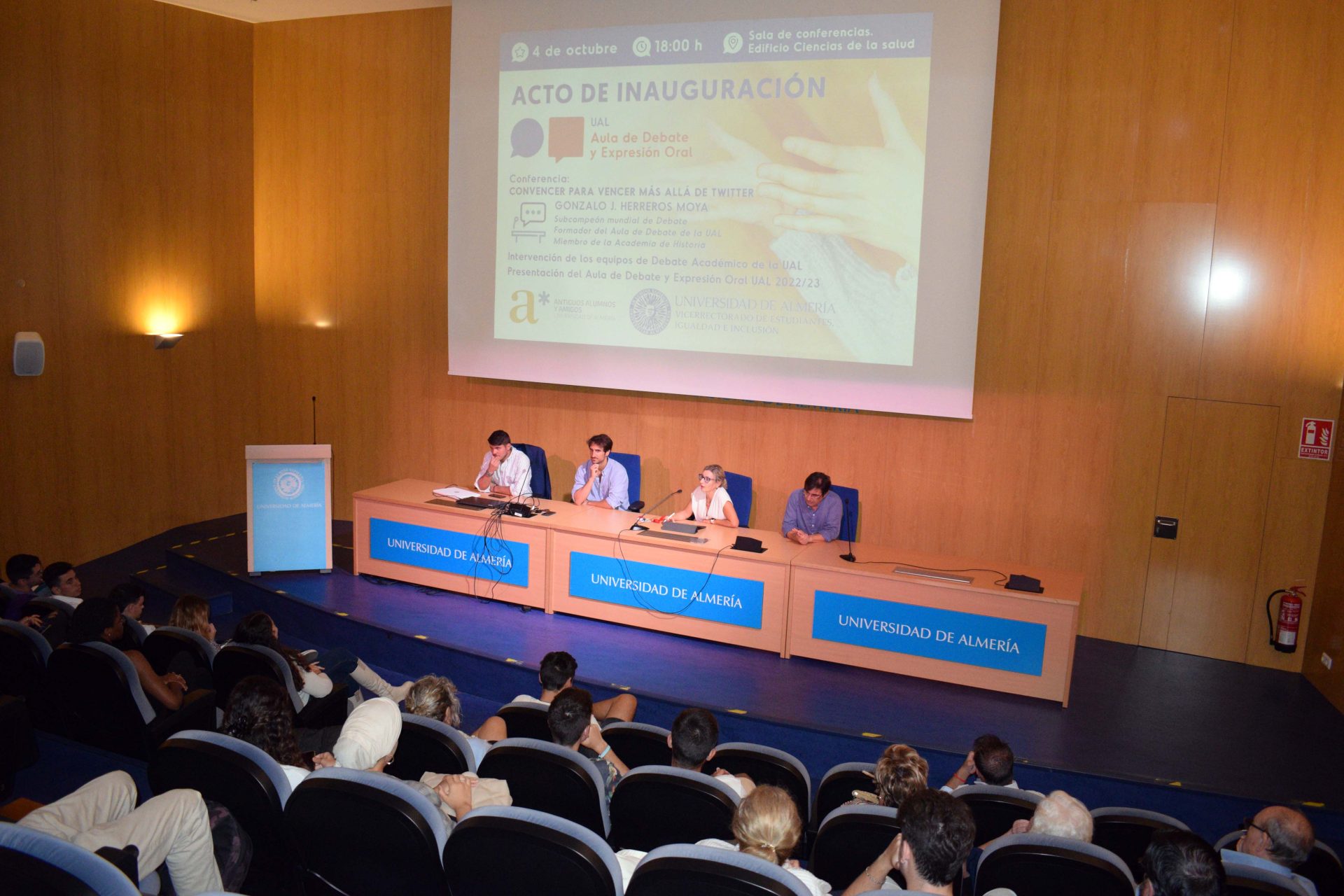 En la inauguración de este curso académico han estado presentes Gonzalo Herreros y Enrique Bajo de Luque, profesores de herramientas de oratoria de comunicación en general y debate competitivo, que cada martes y jueves acuden de forma alterna desde Córdoba a la UAL a dar clase.