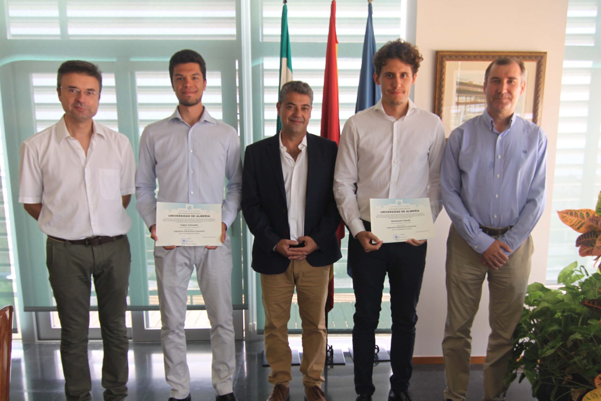 Los estudiantes Emanuele Chiodi y Fabio Colombo, ambos graduados de Laurea Magistrale por la Universidad de Brescia, han obtenido el título de graduado en Ingeniería Electrónica Industrial por la UAL. Son los primeros alumnos italianos del doble título entre la Universidad de Almería y la Universidad degli Studi di Brescia. Su nota ha sido de sobresaliente 9,7, tras haber defendido el pasado 19 de julio el Trabajo Fin de Grado en la Universidad de Almería. Como consideración especial hacia los alumnos del doble título, el rector, Carmelo Rodríguez, les ha hecho entrega del mismo, en presencia del director de la Escuela Politécnica Superior, Antonio Giménez Fernández, y el profesor Manuel Berenguel Soria, responsable en la Universidad de Almería del doble título.