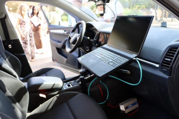 Miguel Ángel Sánchez, de Ingeniería Informática, se ha encargado de “la comunicación del vehículo”. Ya establecida “mediante un control remoto, en este caso un mando de una consola, hemos simulado el acelerador, la frenada y el giro del volante para depurar, y con ese guiado conseguimos que el coche haga un circuito cerrado y esté constantemente dando vueltas”. Francisco José Moreno, de Ingeniería Electrónica Industrial, ha sido el responsable “del automatismo de control de frenado del coche en caso de emergencia, el accionamiento de los actuadores, como puede ser el freno de mano o el pulsador del control de crucero necesario para para poder realizar la conducción autónoma”. Ángela Otero, de Ingeniería Mecánica, ha creado “diferentes soportes para colocar los objetos en el coche, por ejemplo, un servomotor o diferentes instrumentos”, utilizando una impresora 3D”. En nombre de sus compañeros, ha agradecido “la oportunidad de hacer estas becas Talento D-UAL”. No ha dudado en sostener que “salimos de la UAL muy bien preparados, más de lo que creemos”.