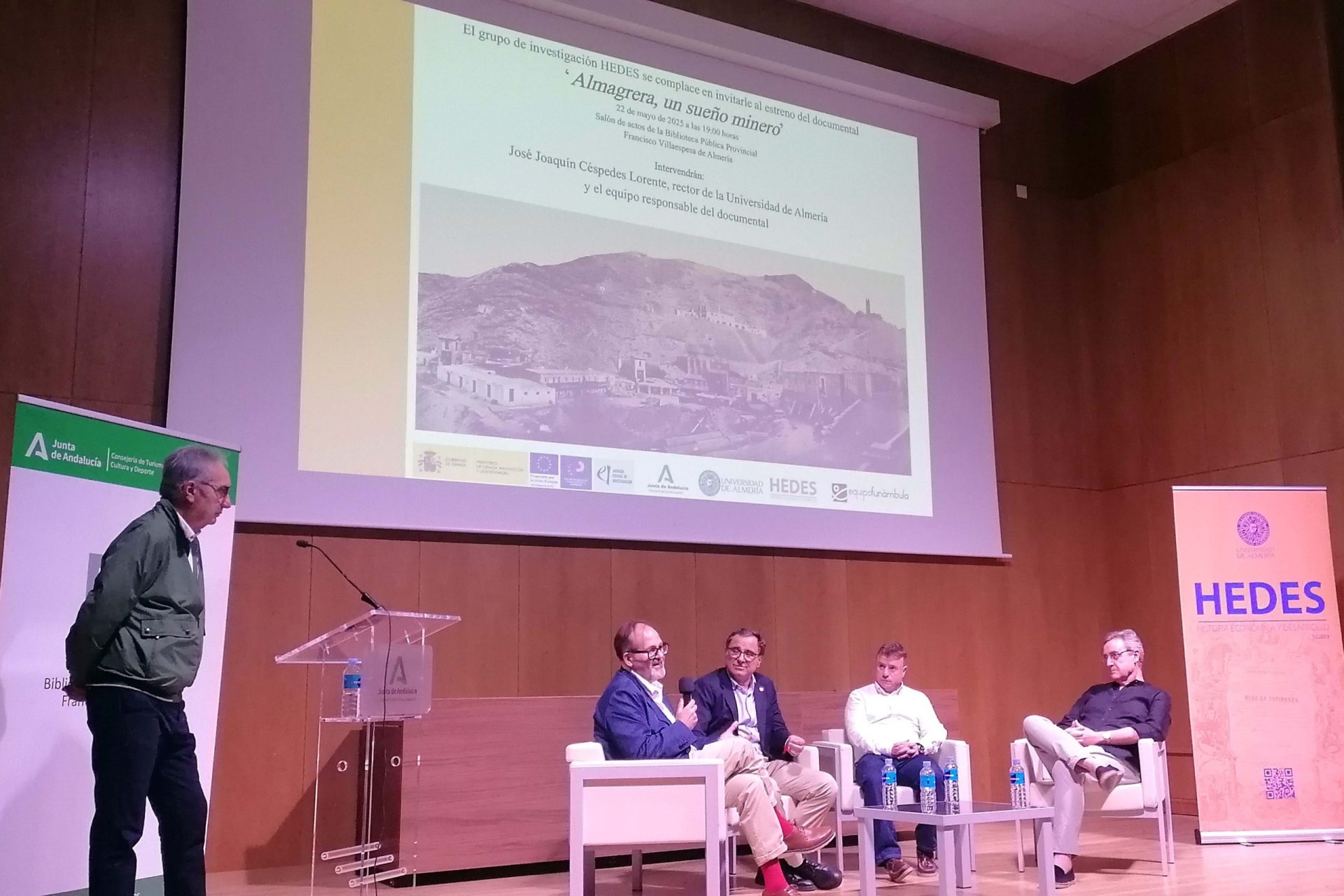 Posteriormente, la exposición se trasladó a la Biblioteca Pública Francisco Villaespesa de la ciudad de Almería, que facilitó sus instalaciones para la muestra, ampliando así su alcance a un público más amplio. En este lugar se proyectó el documental ‘Almagrera, un sueño minero’. El acto de estreno contó con la presencia del rector de la Universidad de Almería, José J. Céspedes Lorente, así como de miembros del grupo de investigación HEDES, como José Joaquín García Gómez y Andrés Sánchez Picón, y del equipo responsable de la realización del documental, Manuel C. Rodríguez Rodríguez y Enrique Fernández Bolea.