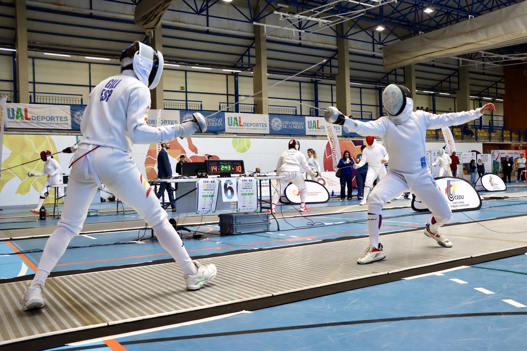 En cuanto a Astrid Ferrando, presidenta de la Federación Andaluza de Esgrima, ha reconocido estar “muy contenta”, además de “muy agradecida” por hacer realidad este CEU, especialmente a la UAL, “que pone todo de su parte para que salga perfecto”. Se ha mostrado sorprendida por el trasiego permanente de público en las gradas del Pabellón A del campus, garantizando espectáculo en todo momento: “El nivel universitario está muy equilibrado a nivel nacional y es muy alto; por ejemplo, en la espada masculina y femenina hay deportistas de nivel incluso internacional, así que quien venga va a ver muy buena esgrima y lo va a disfrutar”. Así será durante todo el campeonato, porque es aplicable a las tres armas.