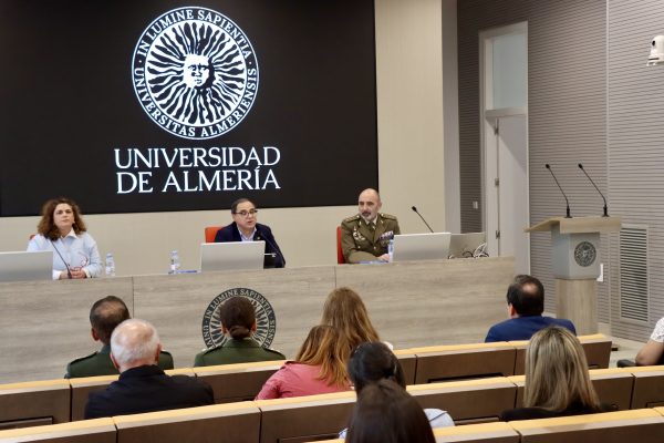 Acto seguido, Juan García se ha encargado de presentar a los intervinientes y de conducir la mesa redonda, en la que las dos figuras principales del CECOSS han sido muy didácticas con sus explicaciones. El general de Brigada Médico David Cobo ha explicado el origen, la estructura y la coordinación institucional del centro, mientras que la teniente coronel psicólogo Pilar Bardera ha dedicado su tiempo a detallar precisamente la intervención psicológica especializada y el enfoque psicosocial en el ámbito militar. También ha intervenido Isabel Martínez, cuya parte se ha titulado ‘Trabajo Social en el modelo CECOSS: acompañamiento, derechos y reintegración sociolaboral’. Juan García, por su parte, ha recordado la larga relación de la UAL y de la Facultad de Psicología con las Fuerzas Armadas, “en 2005 hicimos la primera visita a la Legión”, que pasa por ejemplo con la ejecución de un programa de prácticas curriculares.