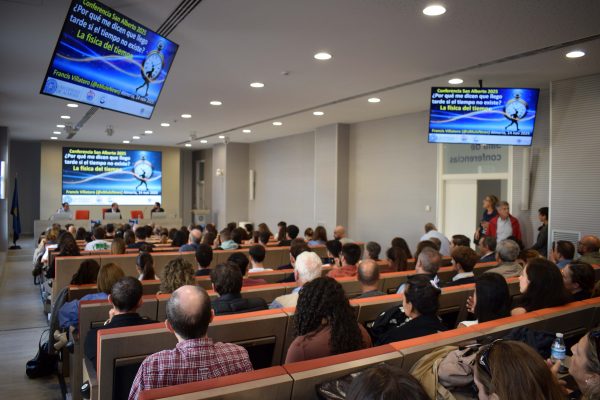 Villatoro ha tenido como objetivo prioritario “que disfruten de la charla y que vean lo apasionante que es la ciencia en general y en particular la Física”. De hecho, la ha contextualizado a la implantación de ese nuevo grado interuniversitario entre UAL y UHU, “hay que celebrarlo”, y se ha centrado en “el tiempo en la vida cotidiana”. El propio título ha sido “un juego de palabras porque el tiempo en física fundamental creemos que es una magnitud emergente, que no es una magnitud física real, sino que es resultado de algunos proceso que por ahora ignoramos, pero eso es lo que nos indica la física cuántica”. Así, “con esa excusa he hablado de la historia del tiempo, pasando por Aristóteles, Galileo, Newton, Einstein… de relatividad, cómo se define el tiempo en física cuántica y todo decorado con muchas anécdotas”. Ha dedicado el final a la neurociencia,  “cómo percibimos con nuestra mente el paso del tiempo con los relojes internos que tenemos en nuestro cuerpo, que se llaman relojes circadianos”.