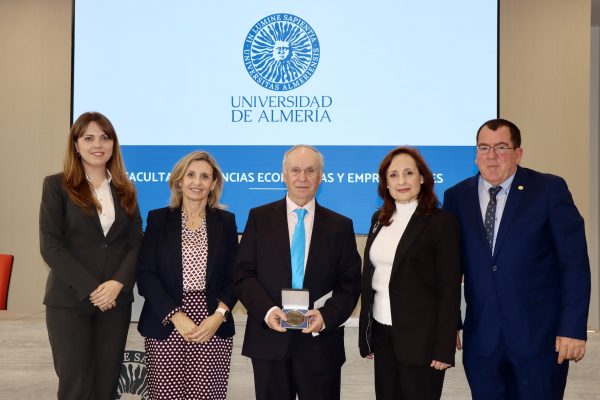 Carmona se ha detenido en la Medalla de la Facultad en este año 2026, reconociendo a José Ramón Pires como “un académico de primer nivel y un maestro de varios profesores y profesoras de la Facultad”. Ha anunciado que tanto Jaime de Pablo como también Rosa María Martínez iban a presentar sus “más que sobrados méritos, pero, por encima de todo, su calidad humana, su espíritu docente e investigador, y su actitud positiva en todo momento”. Los ha descrito en Pires como “valores sobresalientes que se suman al reconocimiento académico de la Facultad”. Así lo han confirmado ambos profesores en sendos discursos emocionados, siendo el catedrático una pieza importante en el desarrollo de aspectos relevantes de la Facultad, como, por ejemplo, su internacionalización y el impulso de la movilidad del estudiantado. José Ramón Pires ha relatado su estrecho vínculo con la Universidad de Almería.